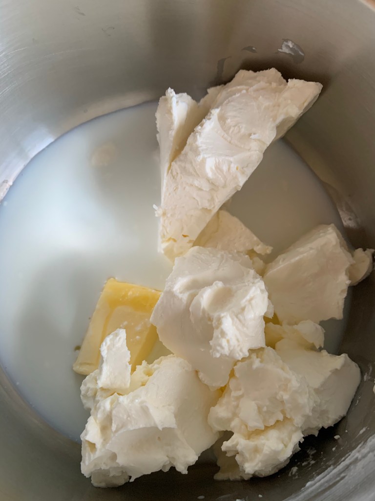 In a heavy bottom sauce pan, over low heat, add in the cream cheese, butter and milk. Let it soften.