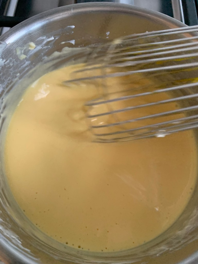 Use a whisk to mix it through till smooth and remove from heat. Add egg yolks into the cream cheese mixture.