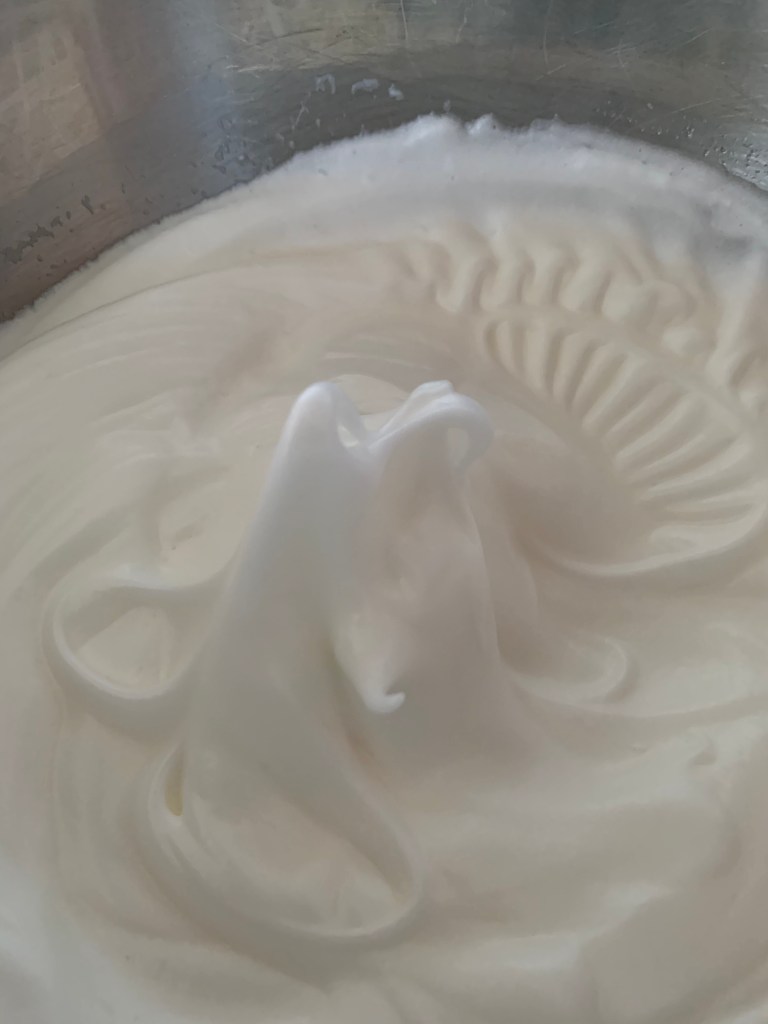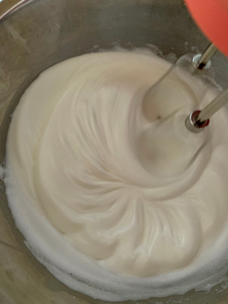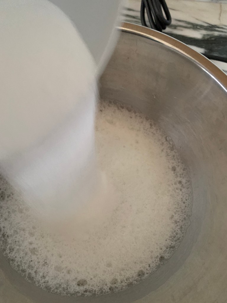 Pour sugar into the frothy egg white then continue beating with a mixer till you get shiny soft peaks.