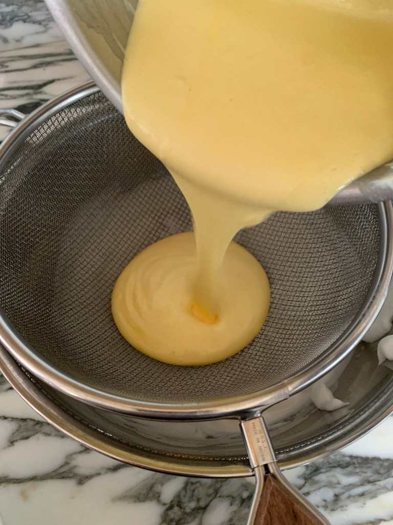 Put a sieve over the egg whites and pour your cream cheese mixture into the sieve. Filter out lumps if there are any.