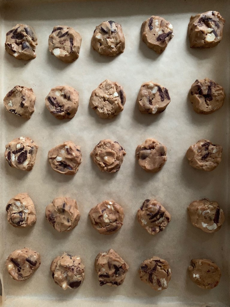 This is the point that you have choices. You can either put it all into a container and scoop them later using a small ice-cream scoop/tablespoon or you can roll them into logs like below, wrapped in baking paper or waxed paper. They are approximately 2″ in diameter.