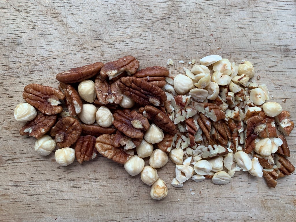 Warm a frying pan on a low heat. Add in the pecans and hazelnuts while the pan is still cold. Every 10s, give the nuts in the pan a little toss. Put it back on the fire and repeat till you feel the nuts are hot.