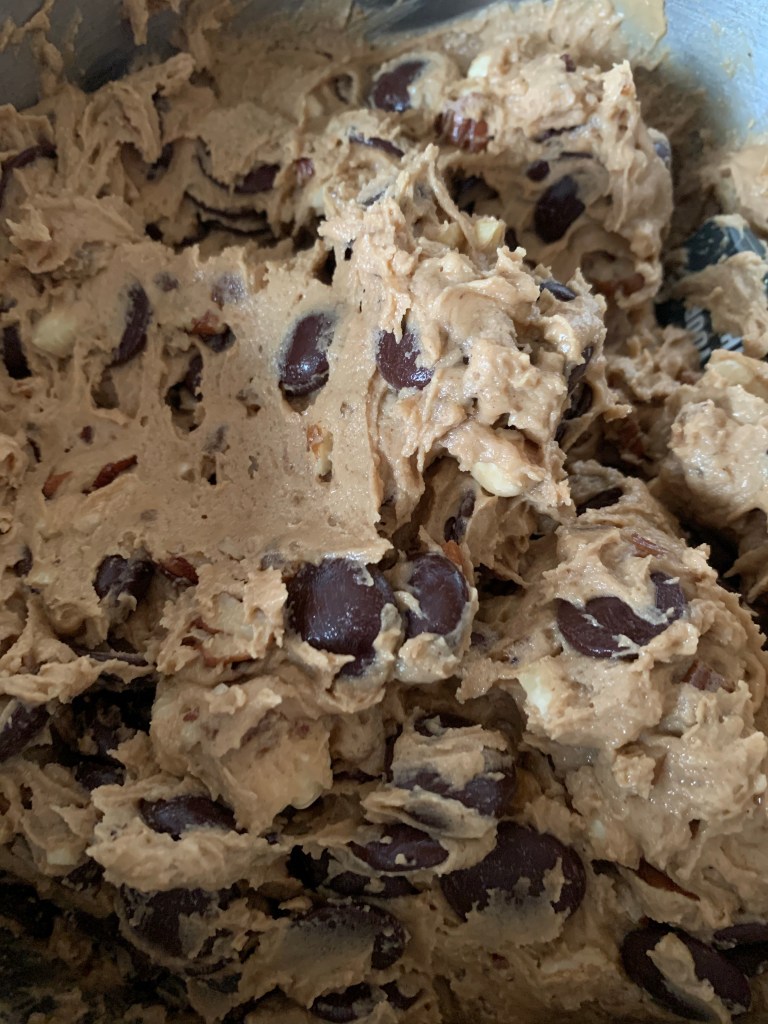 Put it on your chopping board, let it cool and chop it roughly like below. Add the chop nuts to the candied peels and chocolate (items in purple). If you are using chocolate that is big in pieces, chop them into smaller pieces.