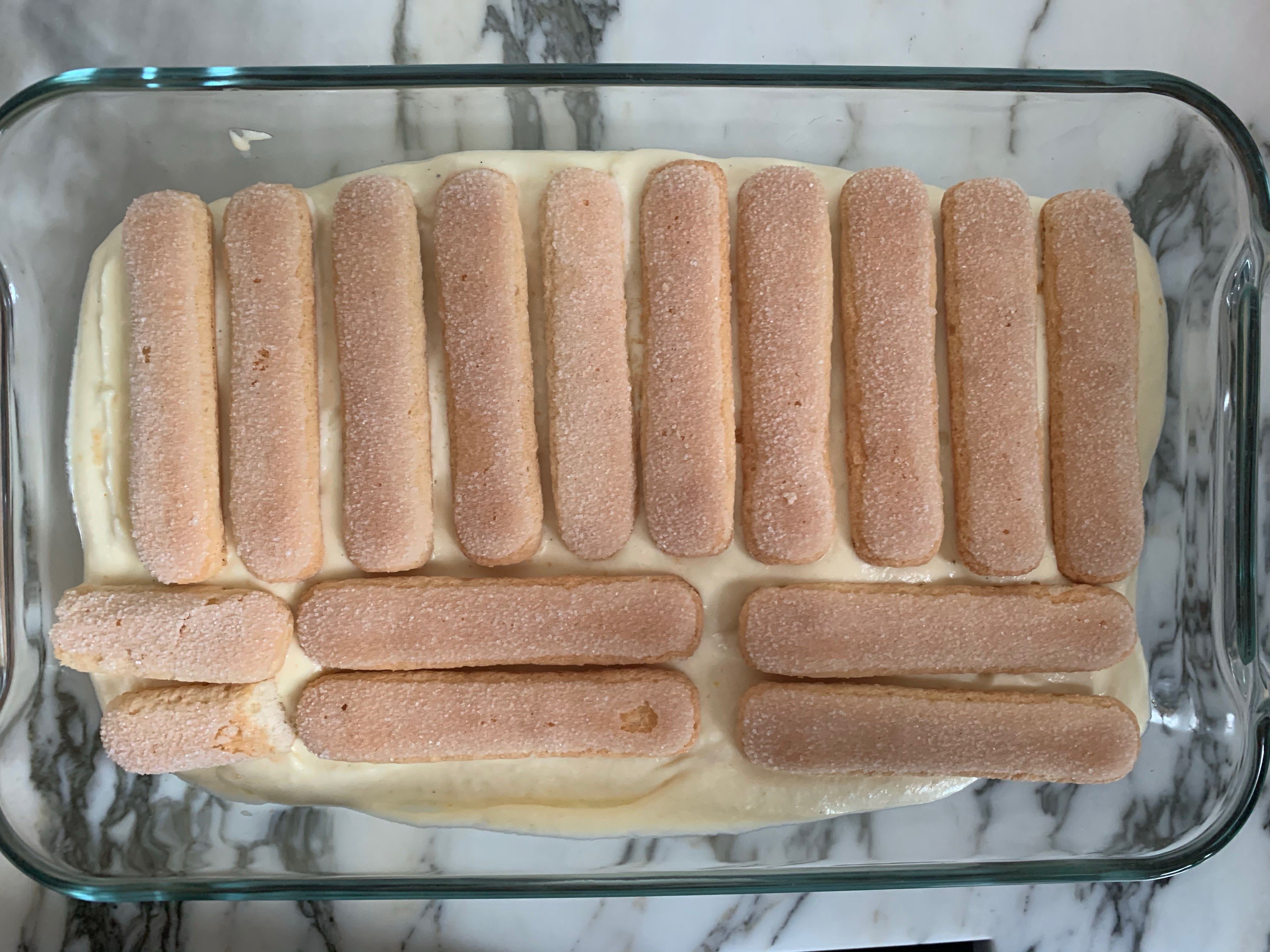 - Arrange a second layer of ladyfingers. I would arrange them out in the opposite direction. Meaning if I had most of them horizontal for the first layer, this one would have most of them in a vertical fashion. Plainly preference. You can decide to layer both layers in the same direction, your call.
