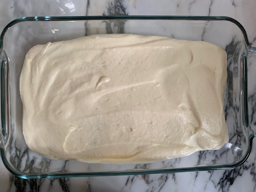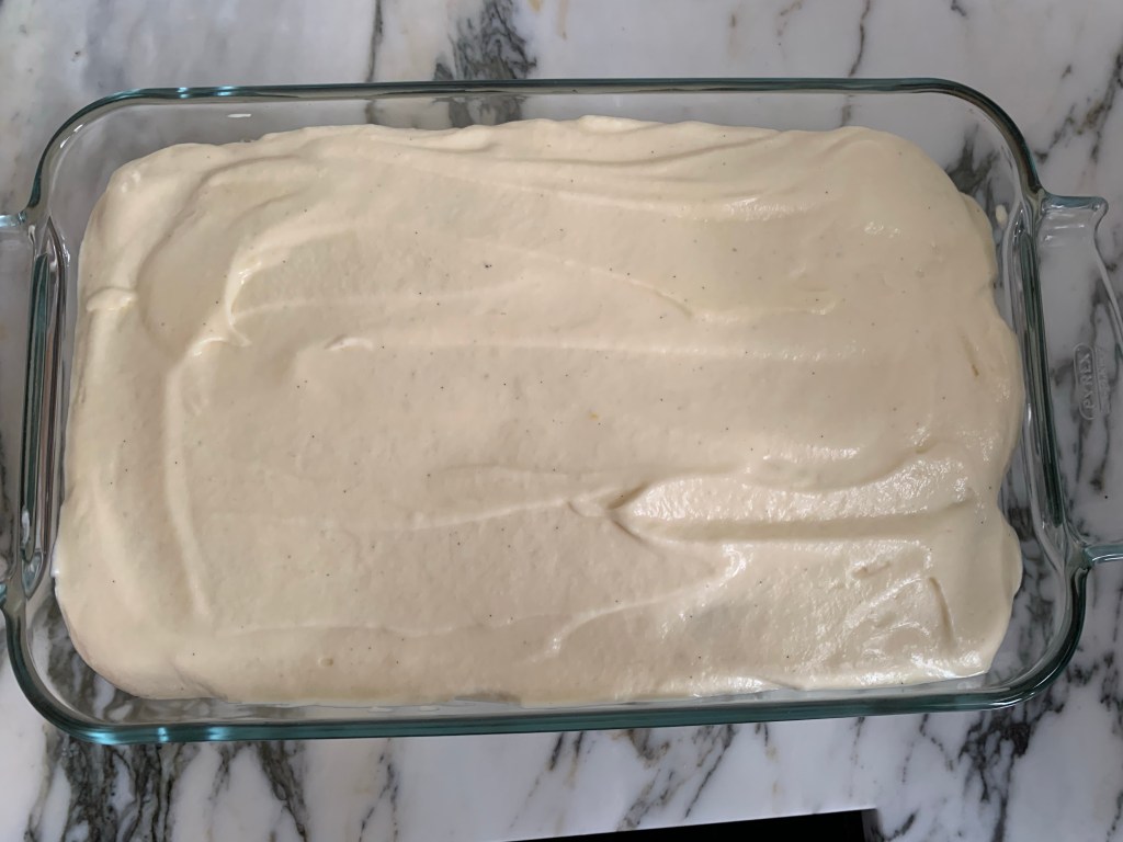 - Put the cream over the first layer of soaked ladyfingers.