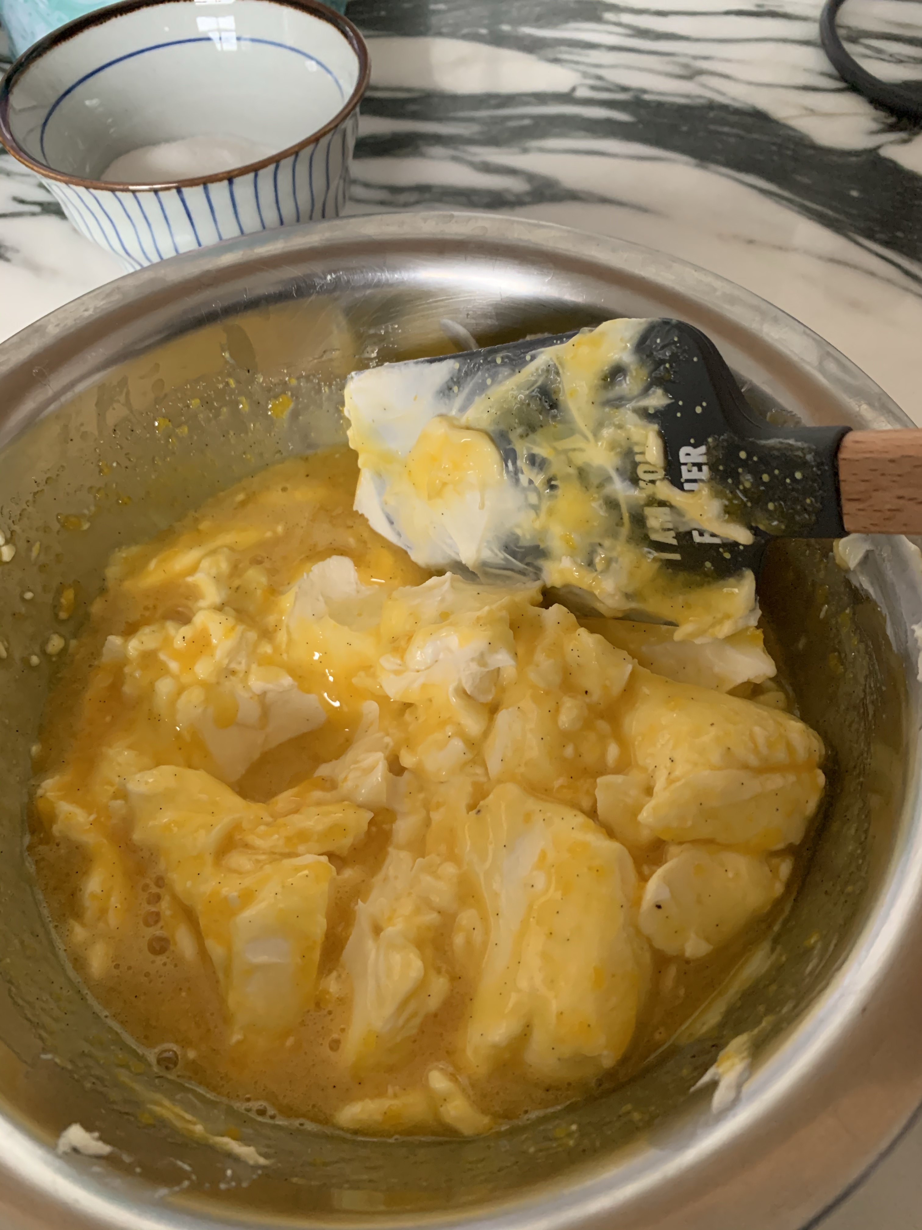 – Add in the mascarpone to the egg yolk mixture.